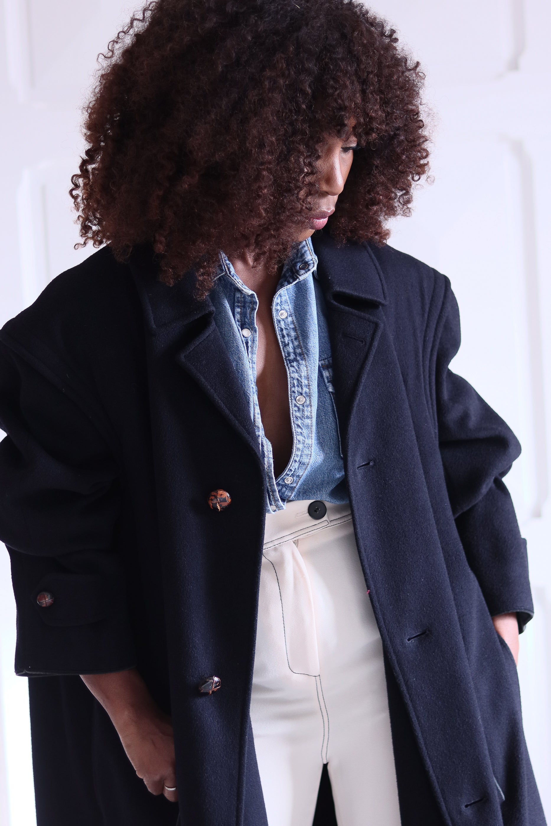À porter comme sur la photo : sur une chemise en jean et un pantalon clair pour un contraste moderne, ou sur un total look monochrome pour un effet chic minimaliste