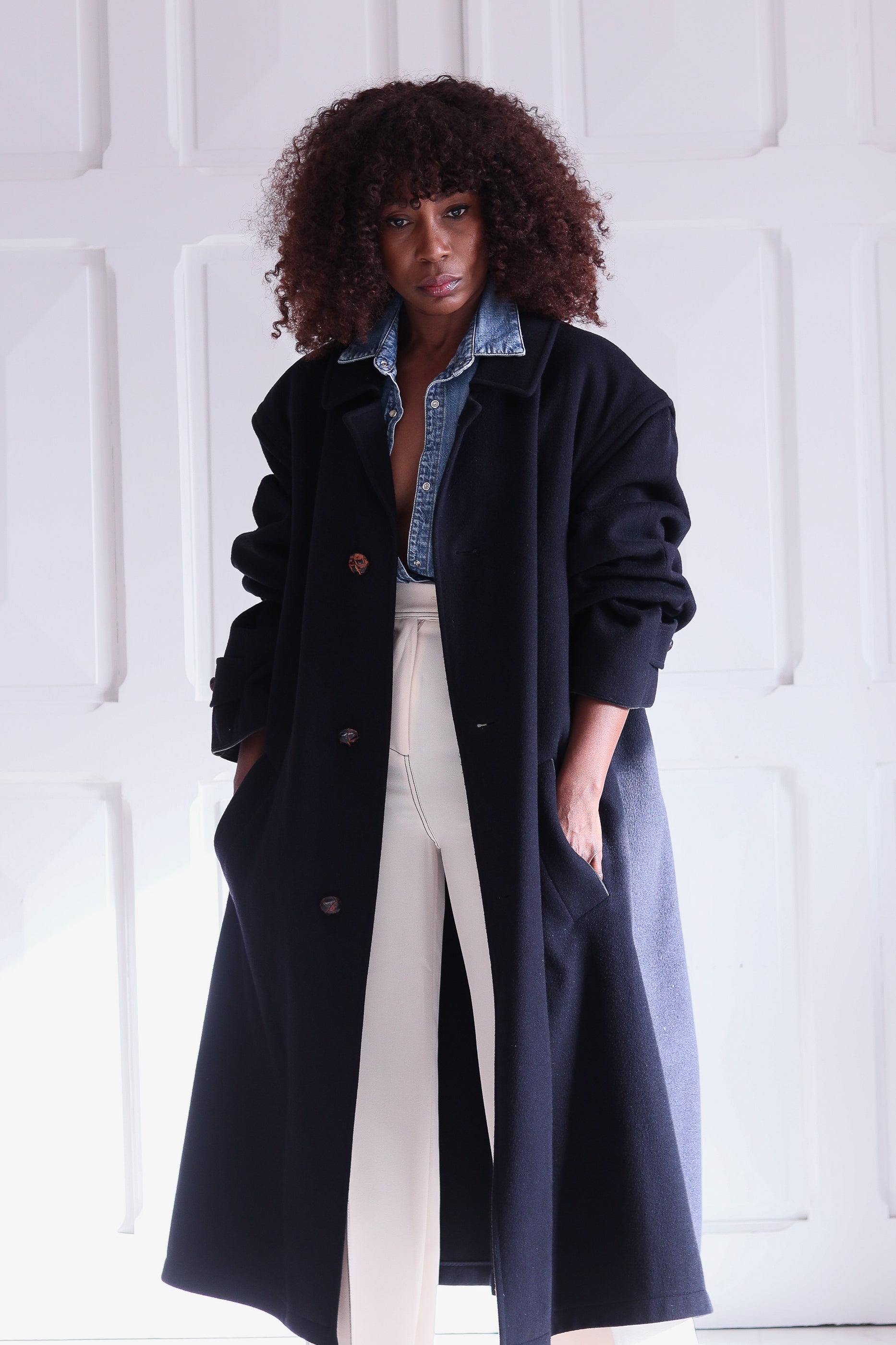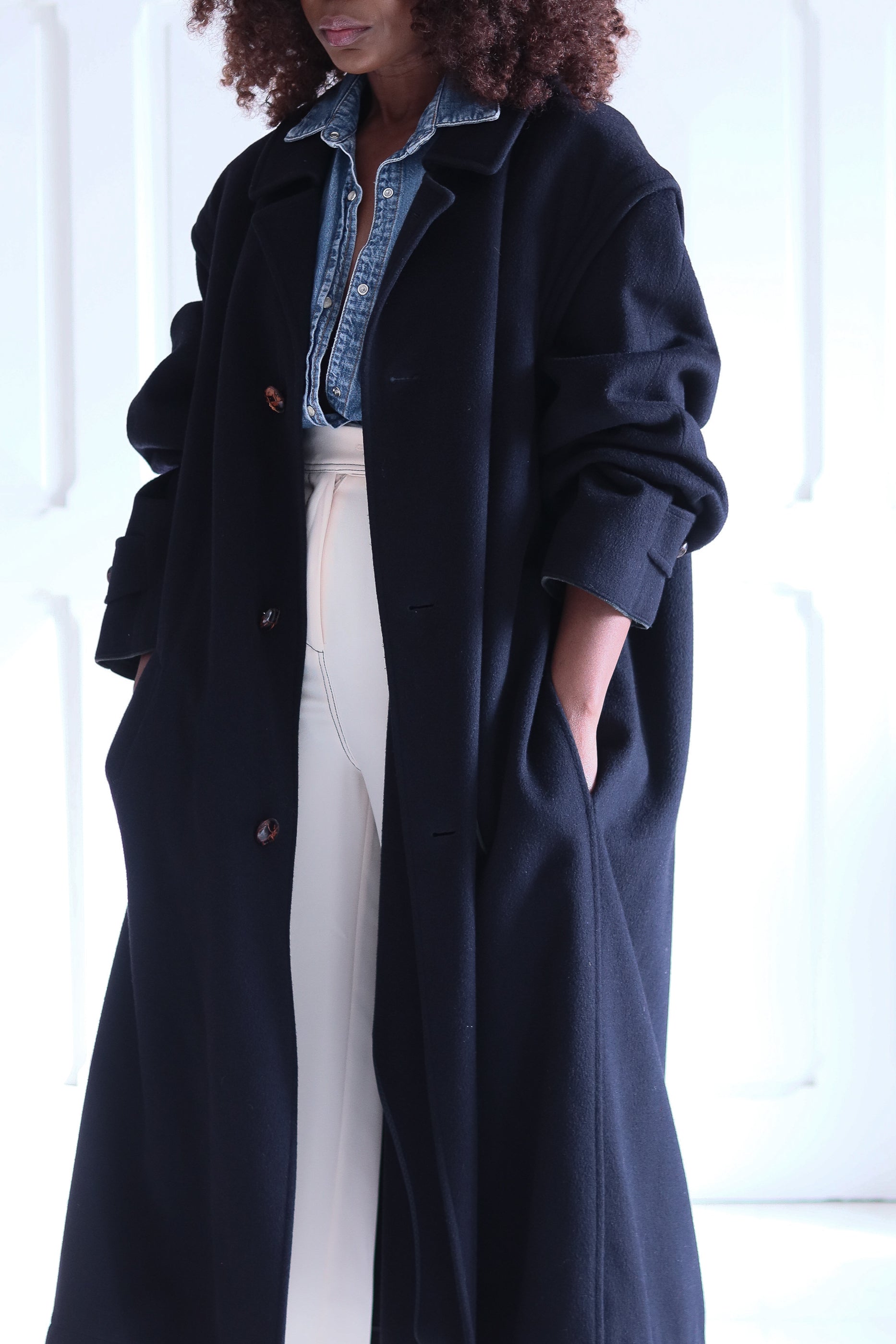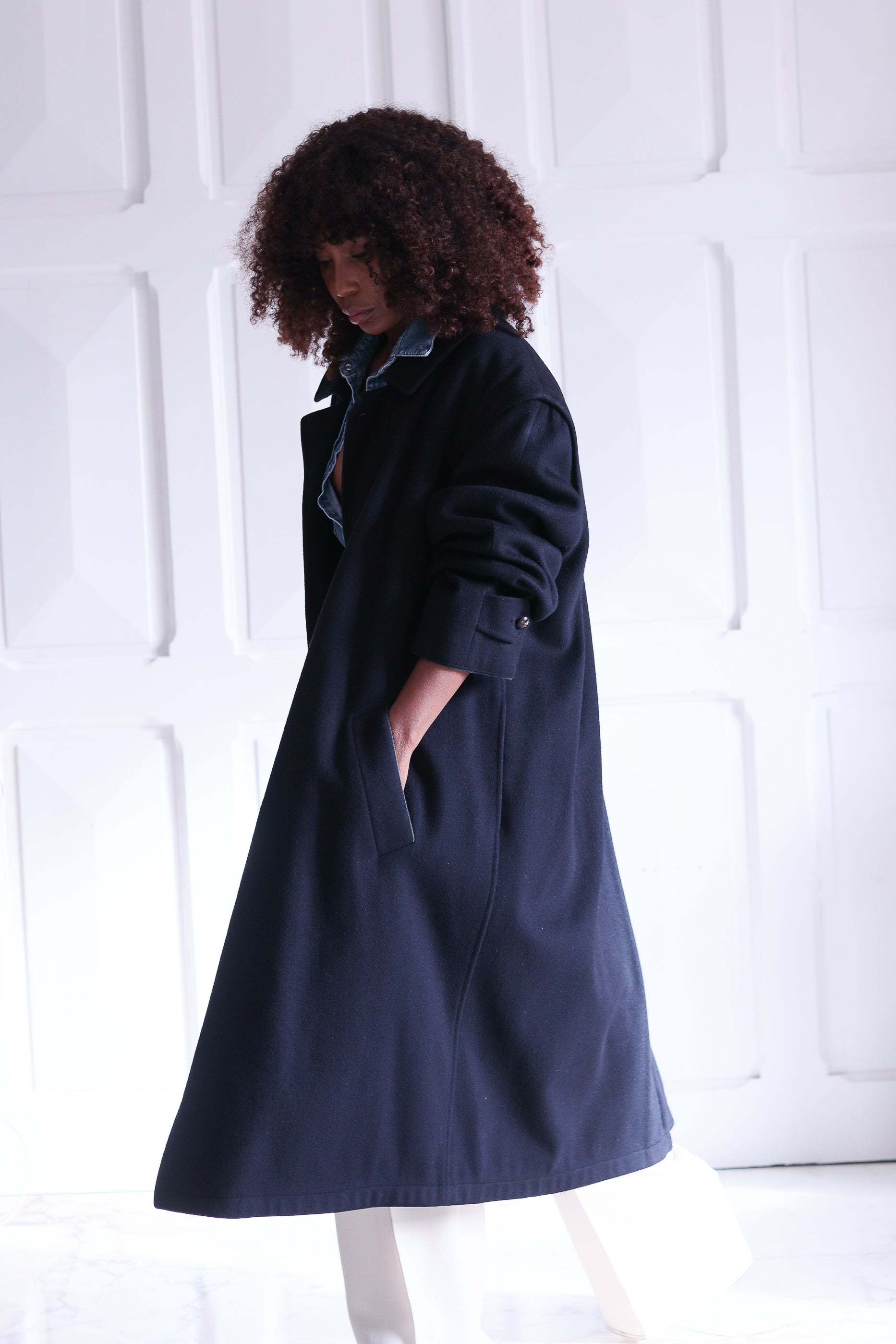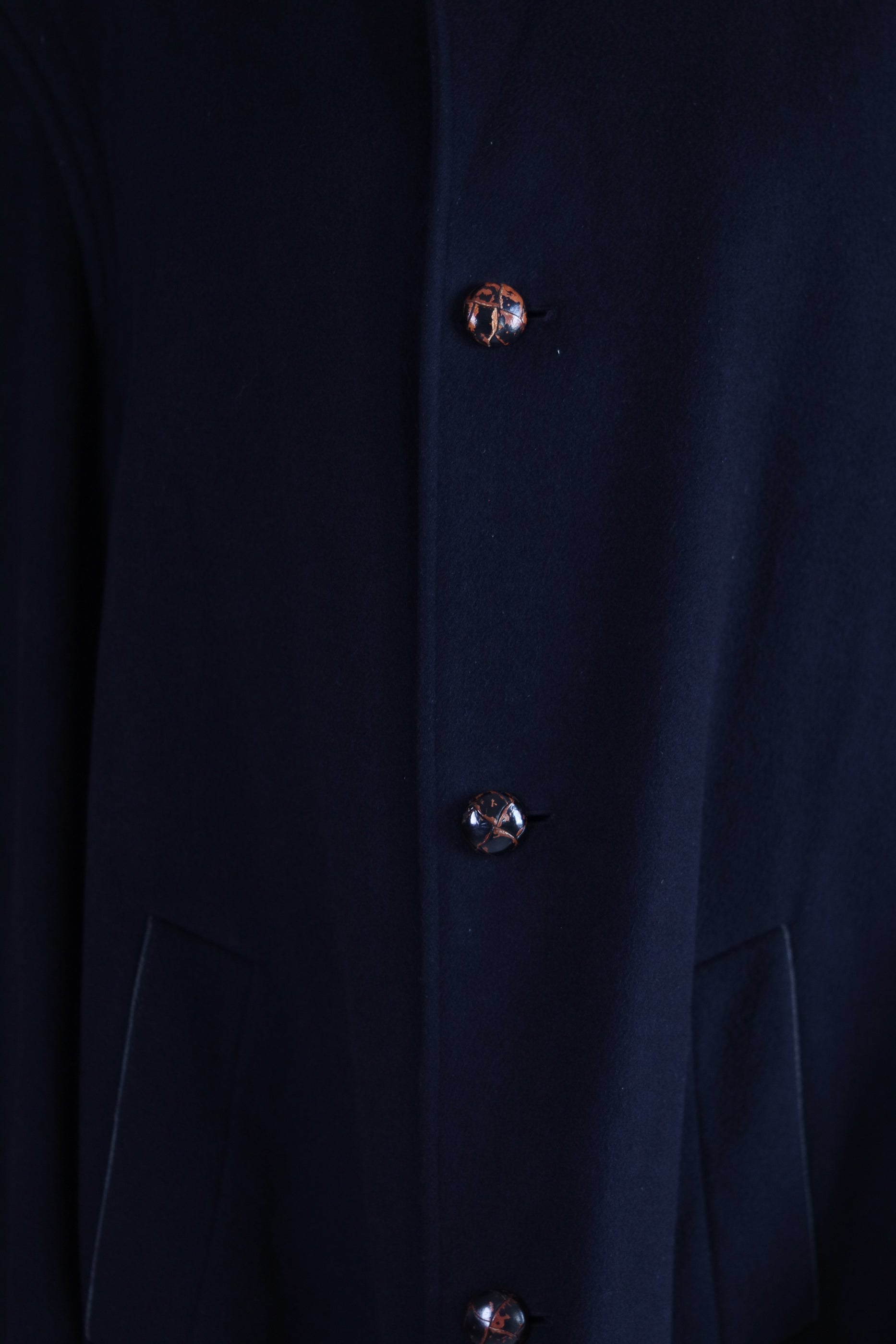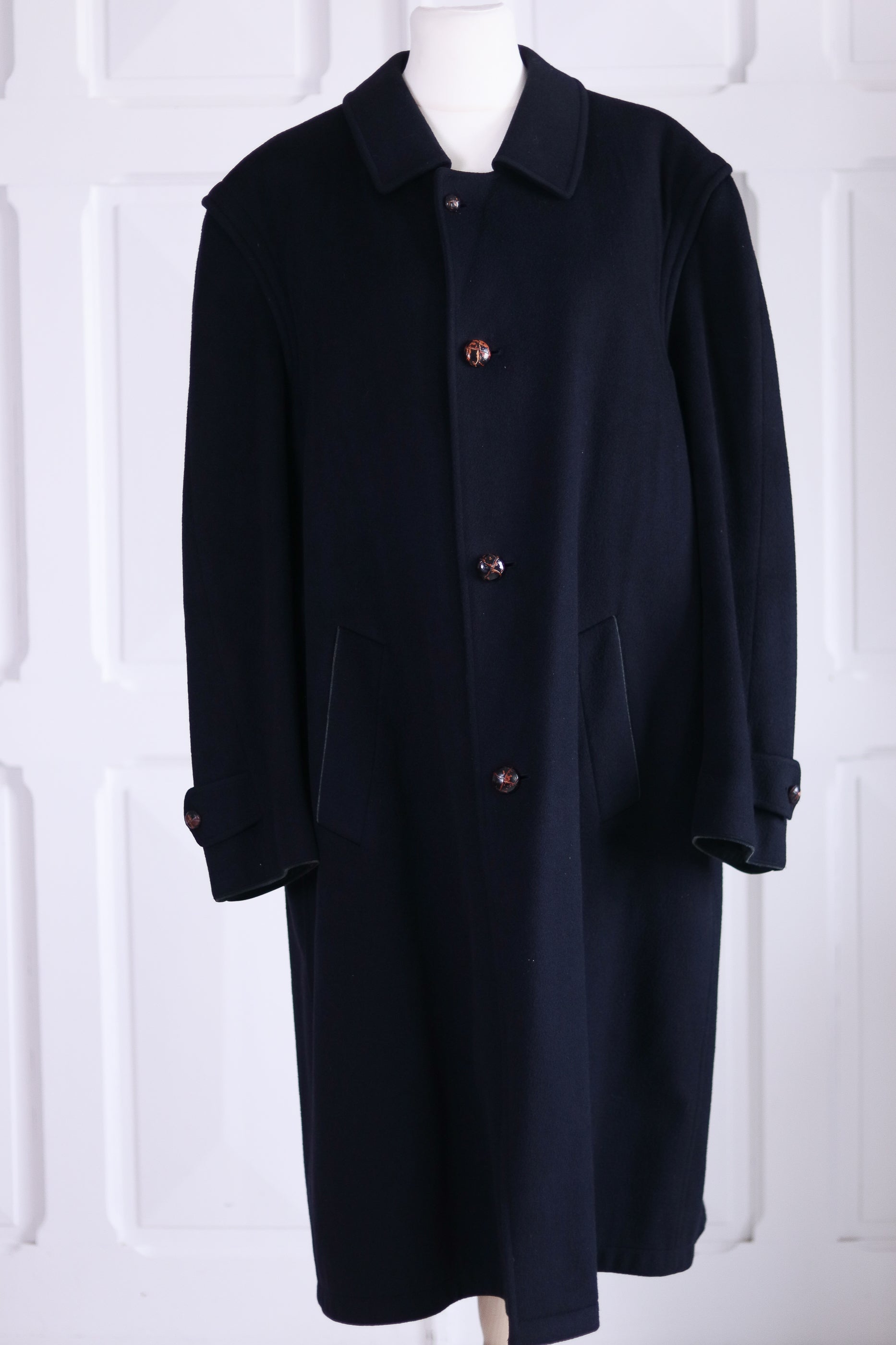 Son bleu sombre profond, ses grands boutons effet corne et sa coupe oversize structurée lui donnent une allure à la fois forte et intemporelle, l’élégance pure du vintage alpin. avec ouverture dessous les aisselles pour une meilleur aération