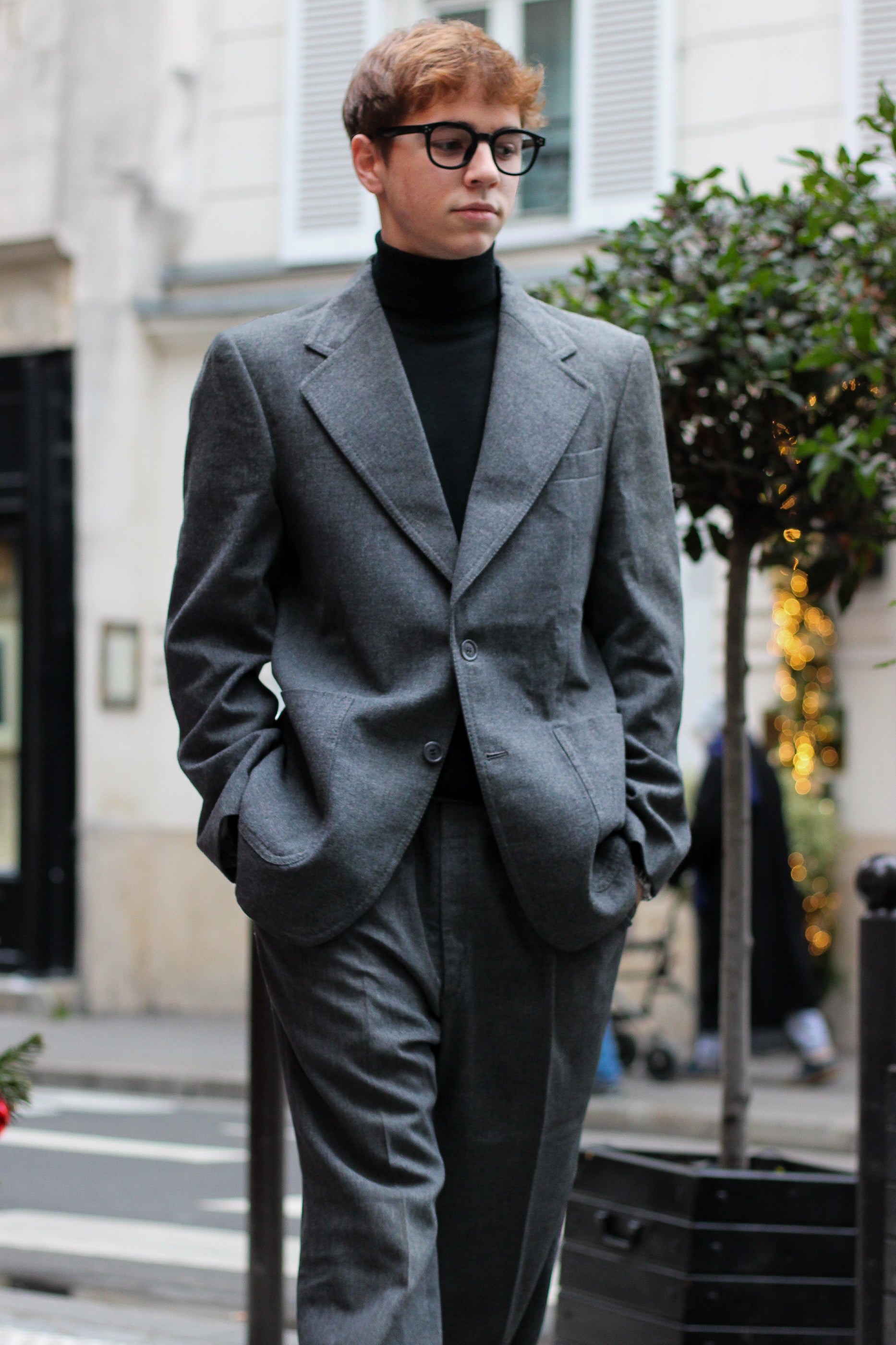 Le pantalon est taille haute mais peux se porter taille basse aussi, coupe droite à légèrement ample, dans l’esprit seventies de l’époque. Costume de confection sur-mesure en laine