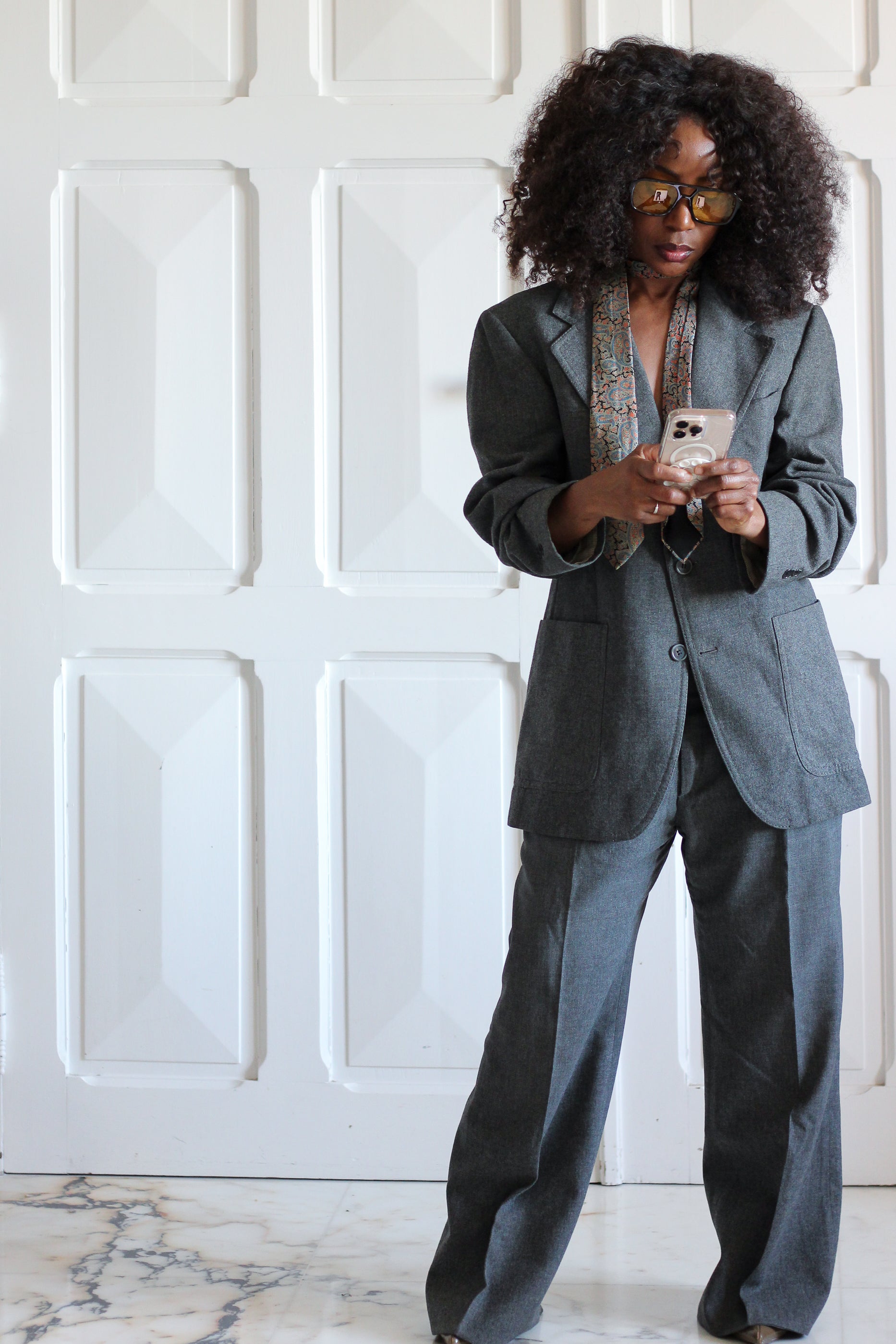 Élégant costume vintage deux pièces gris chiné, datant des années 1970.