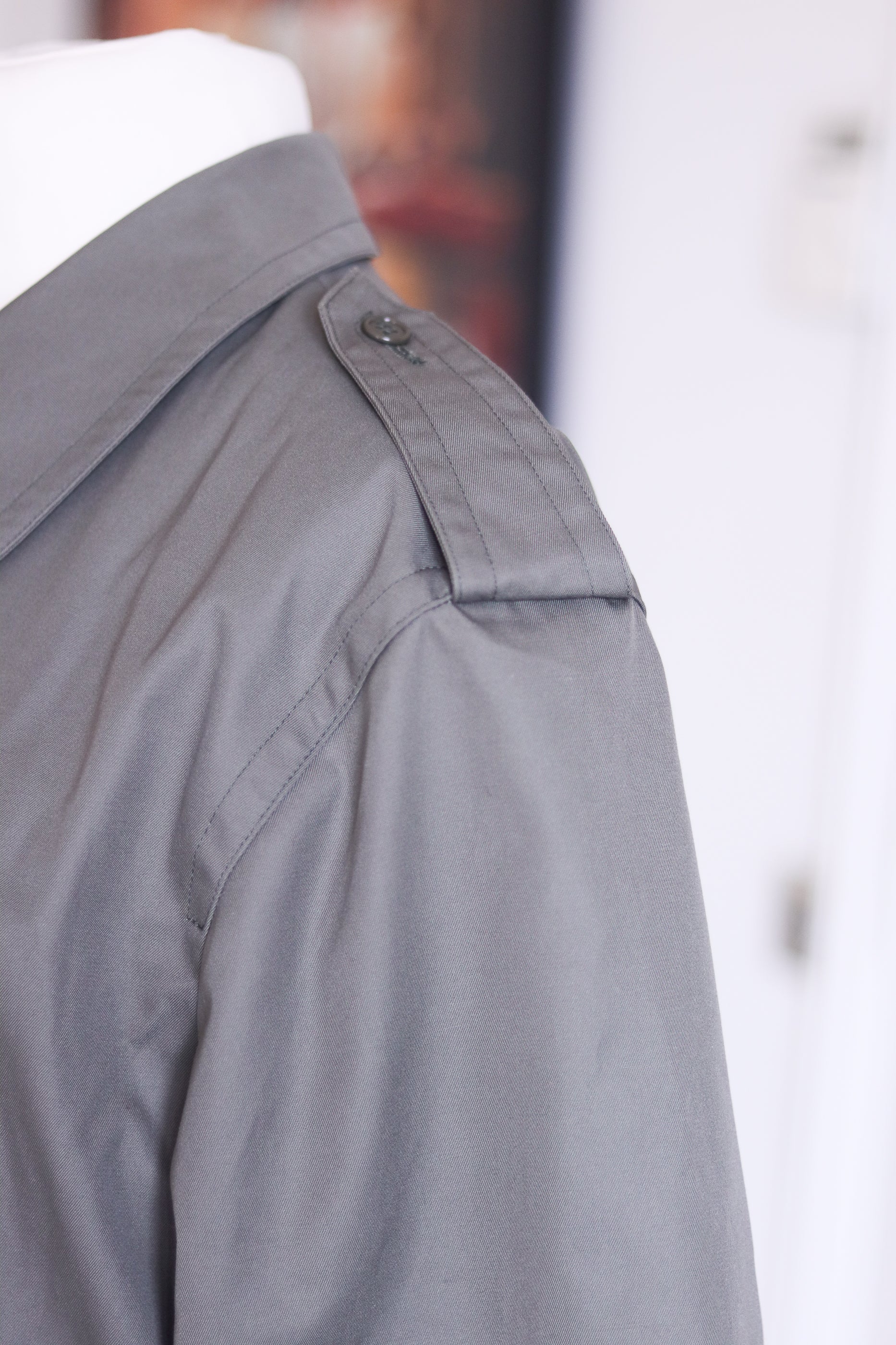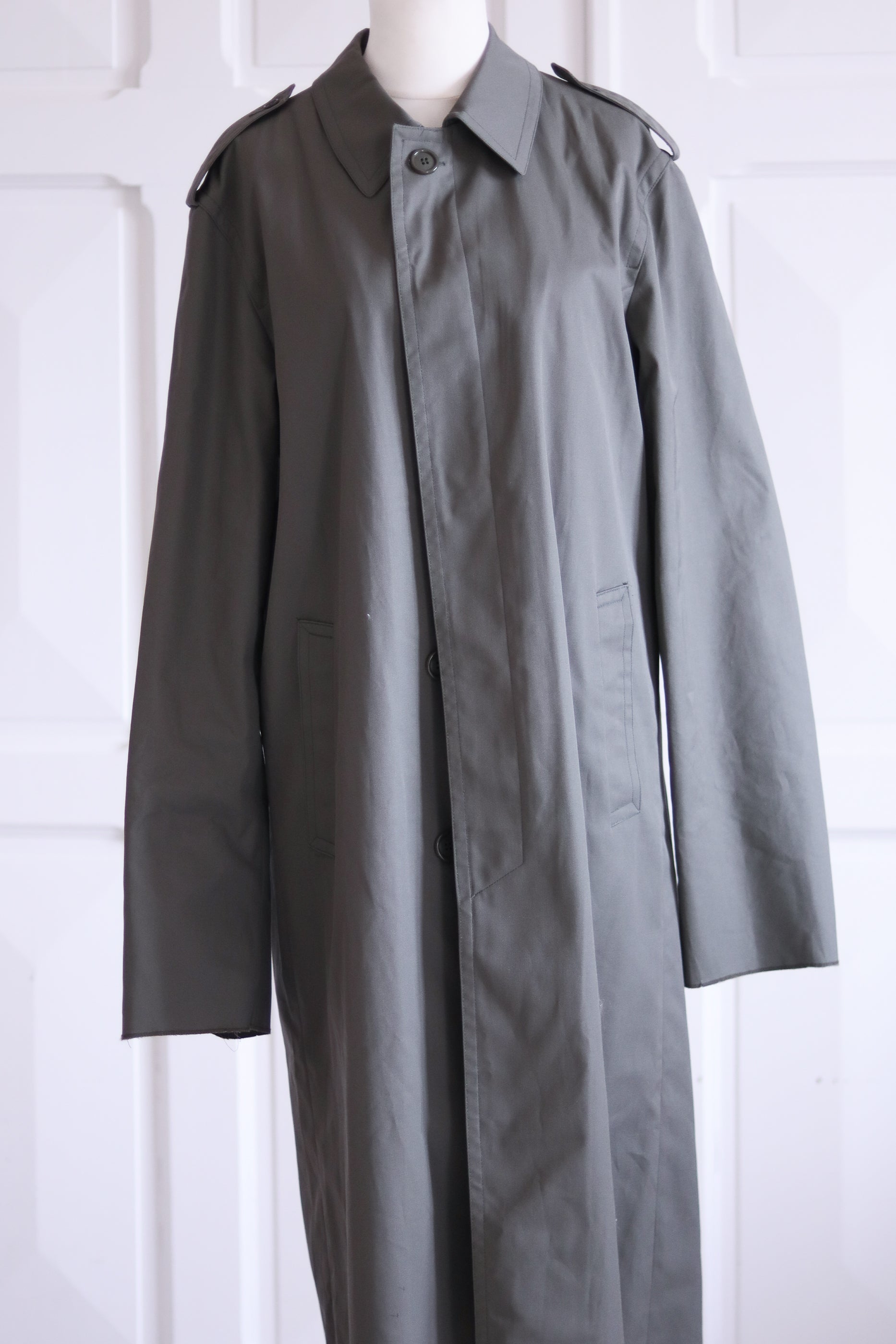 Fabriqué dans une gabardine de coton technique, il offre un tombé fluide mais ferme, idéal pour les mi-saisons. On retrouve les détails militaires typiques : épaulettes, boutonnage croisé, fente d’aisance au dos, et une coupe droite oversize qui respire le chic nonchalant.