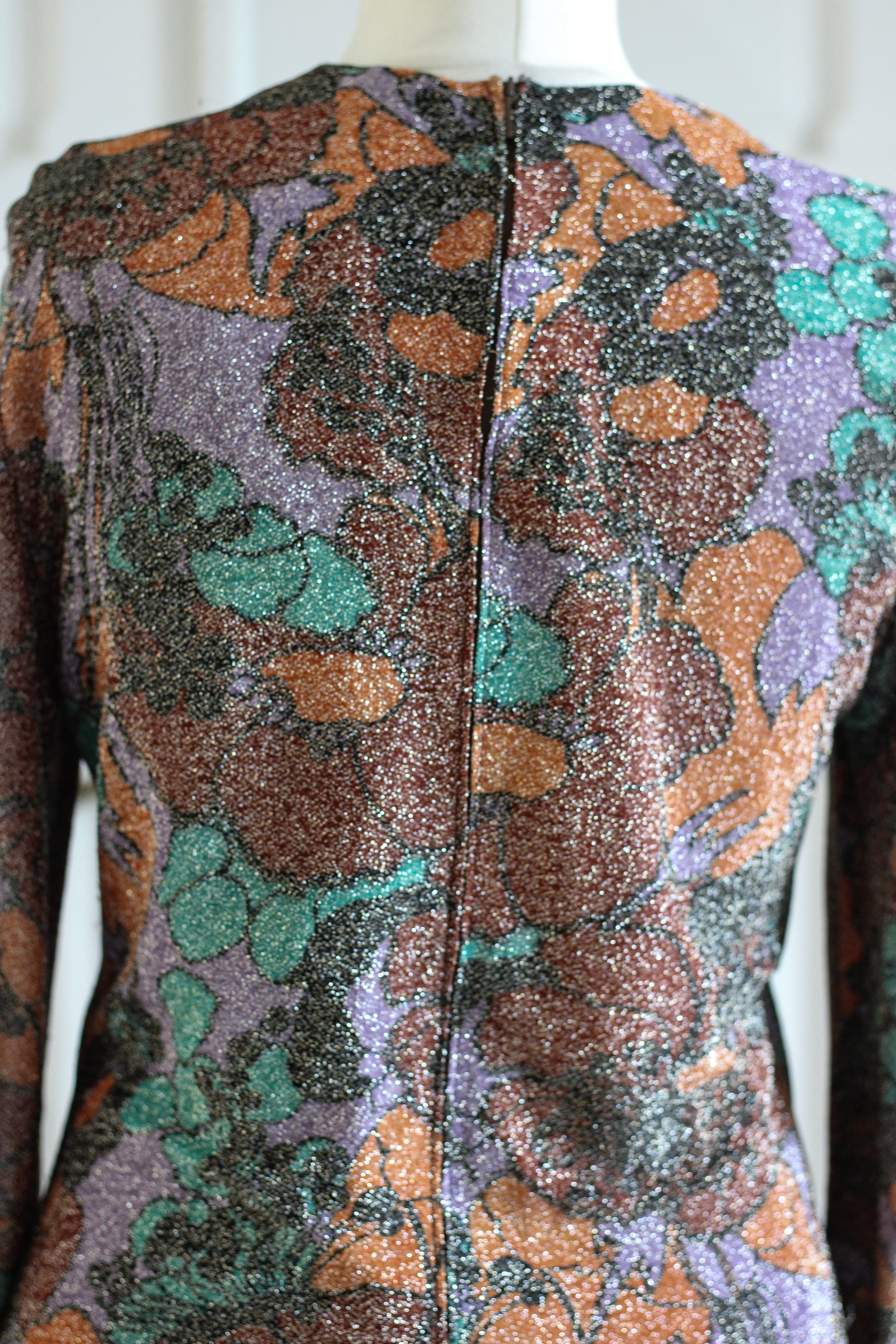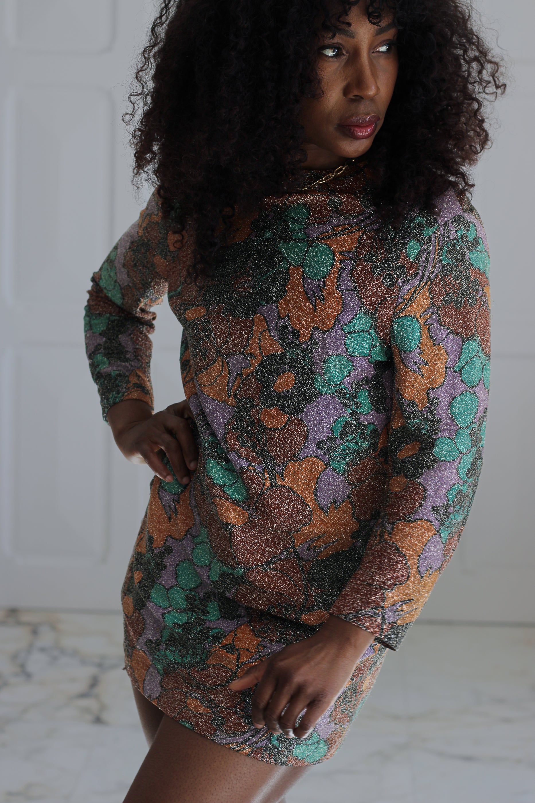 Mini robe au motif floral psychédélique, entièrement réalisée dans un tissu lurex scintillant. Une pièce lumineuse et graphique, typique de la fin des années 60.