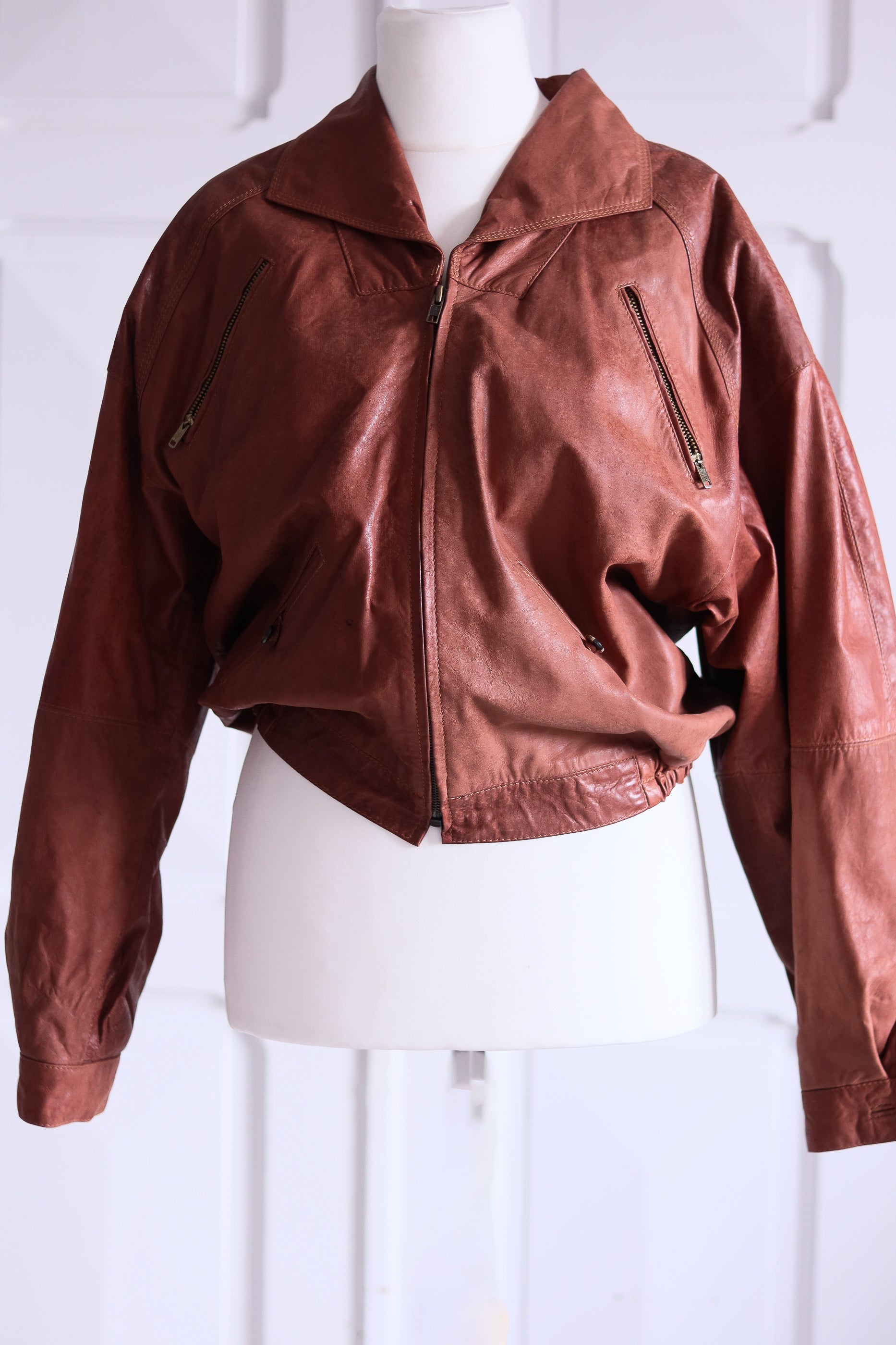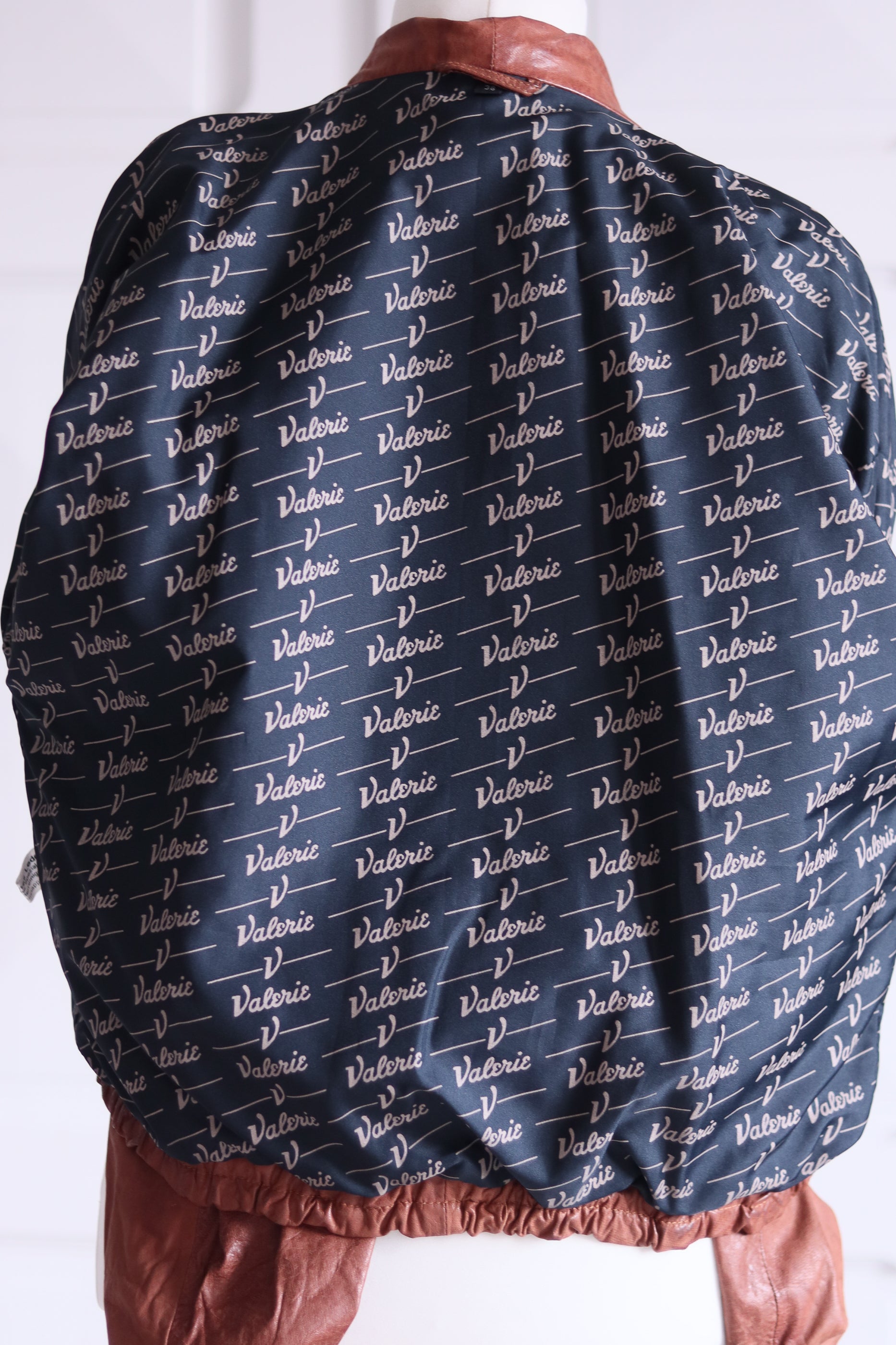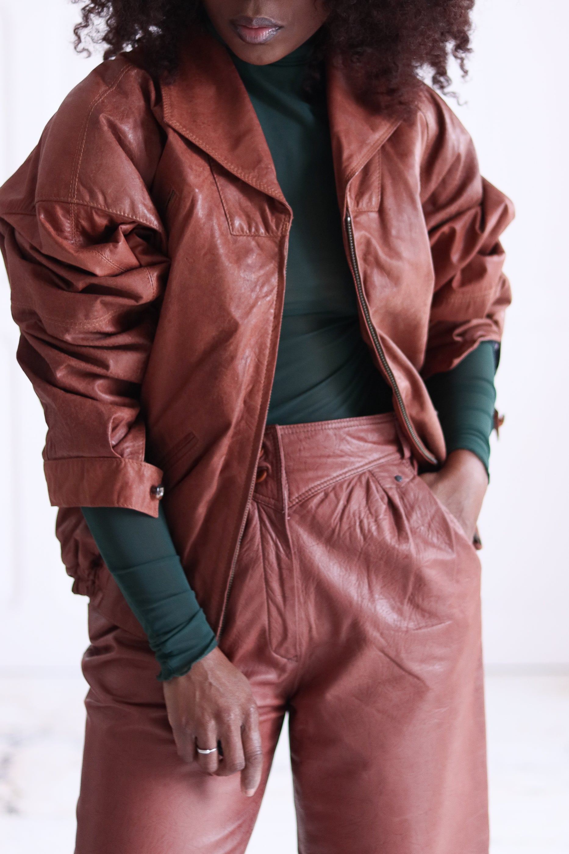 Un ensemble vintage de caractère, signé Valérie, confectionné en cuir souple couleur cuivre. Le blouson oversize au col large et aux zips métalliques s’associe à un pantalon taille haute pour une silhouette puissante, belle pièce vintage des années 1980.