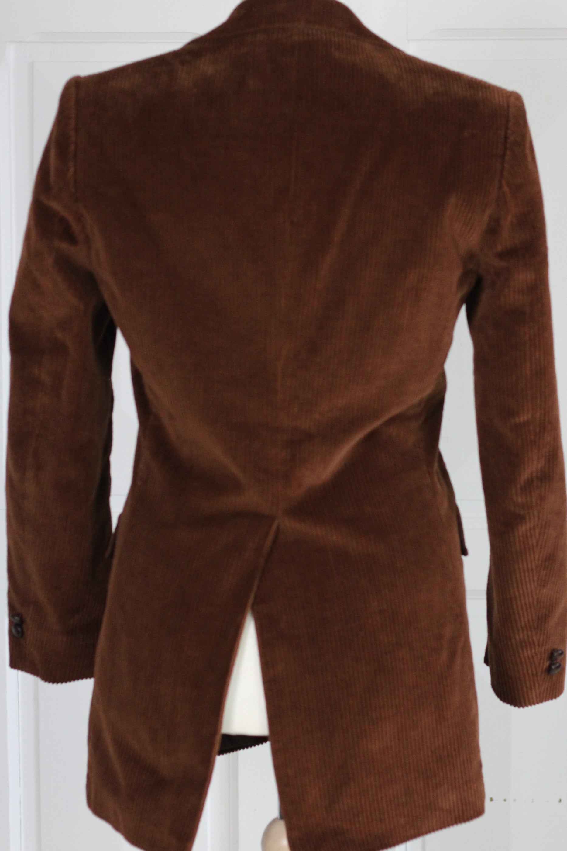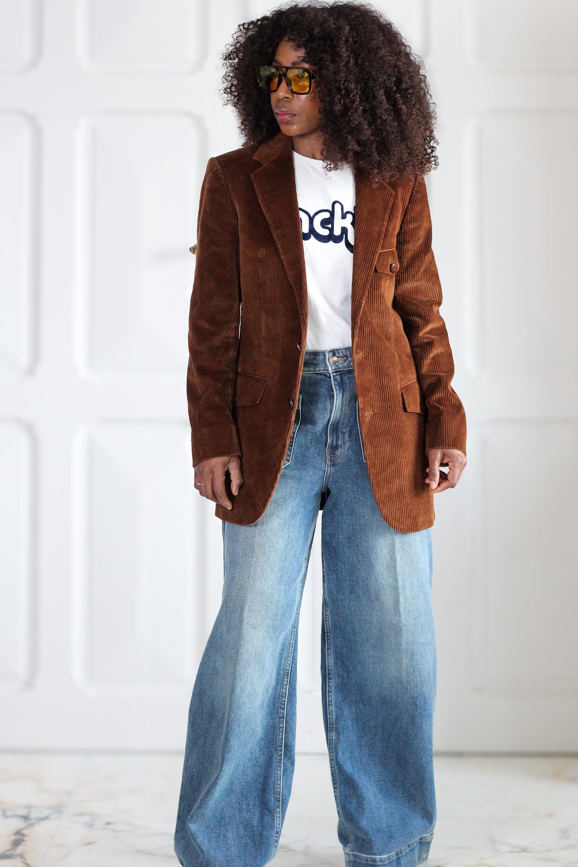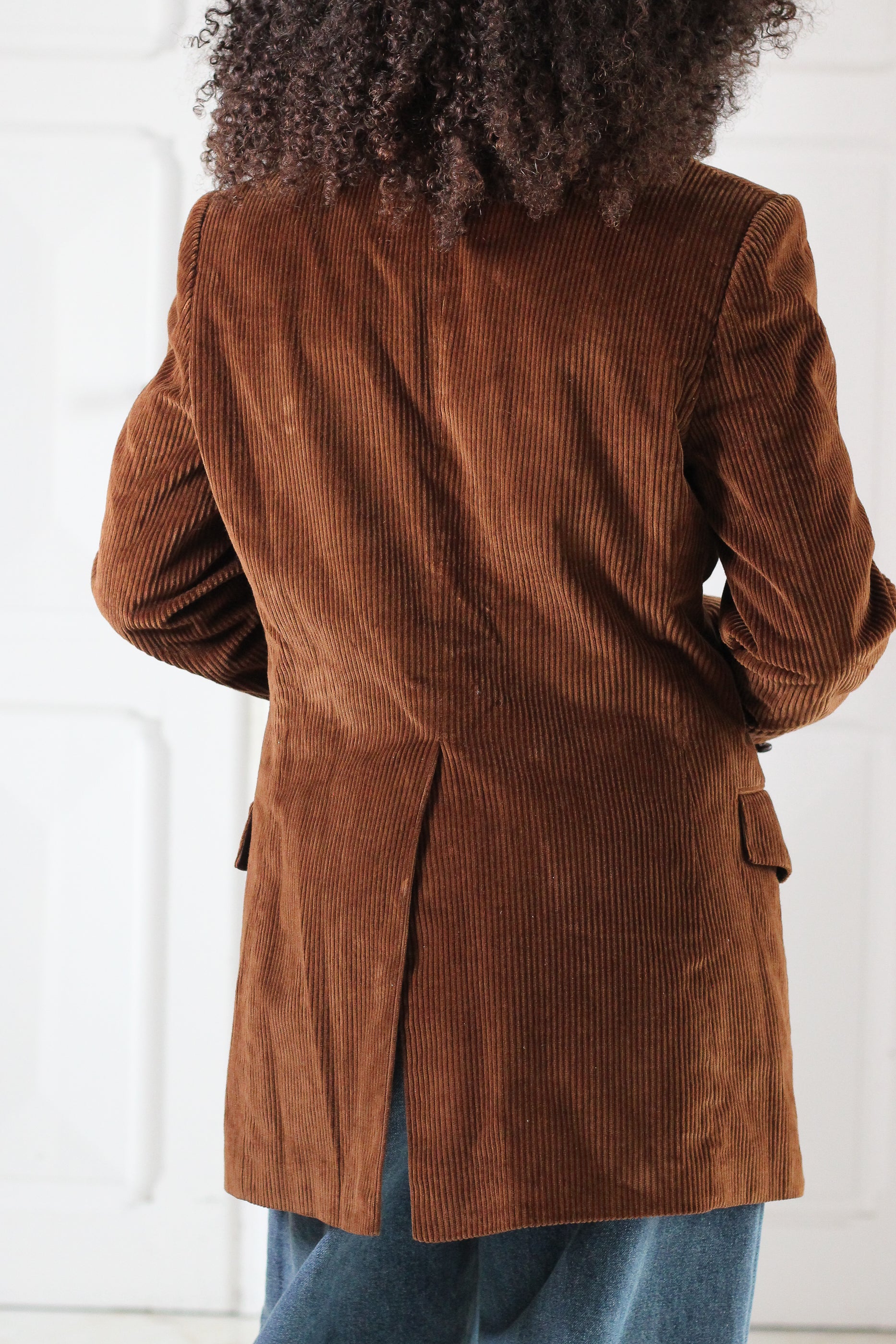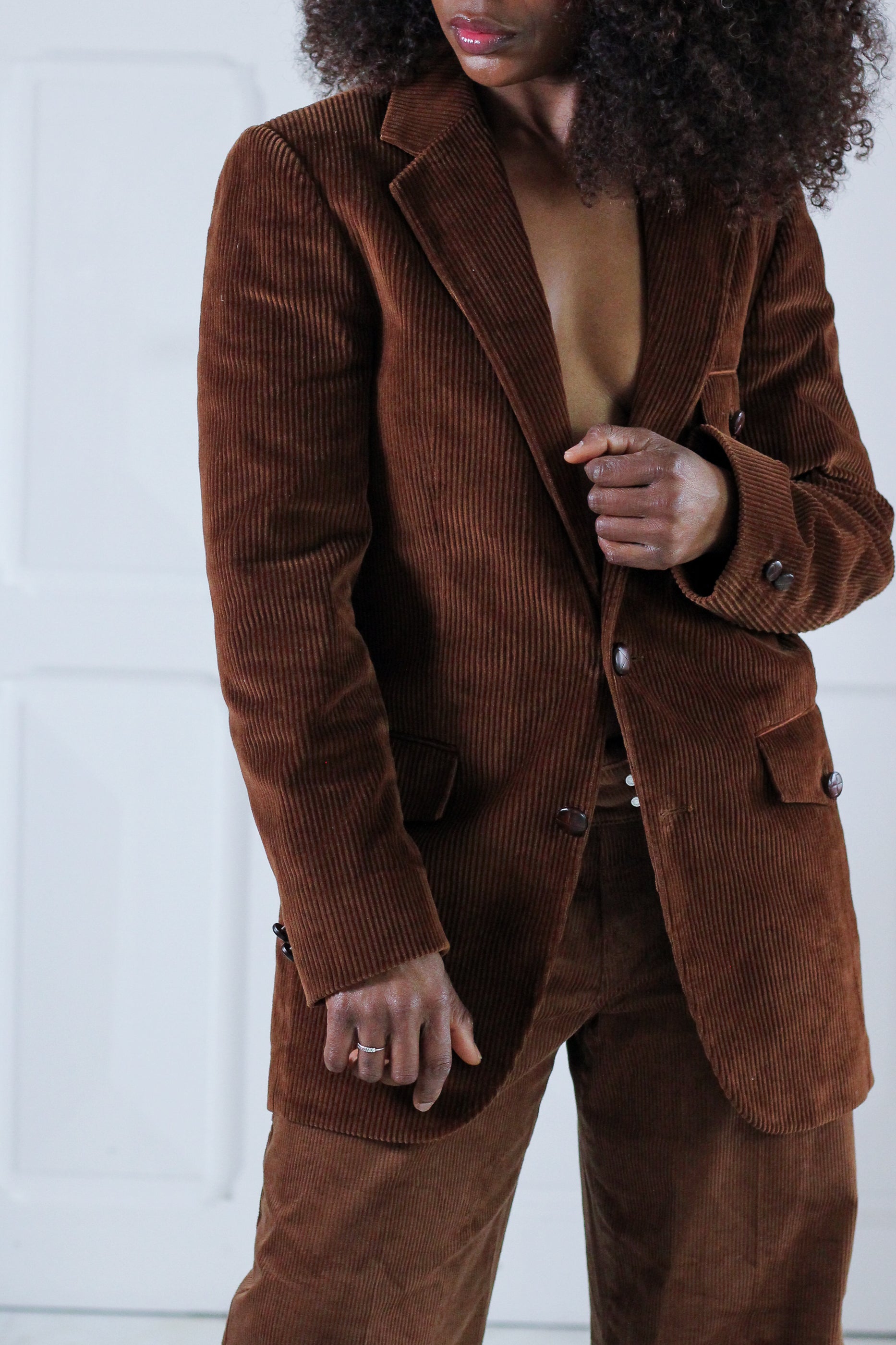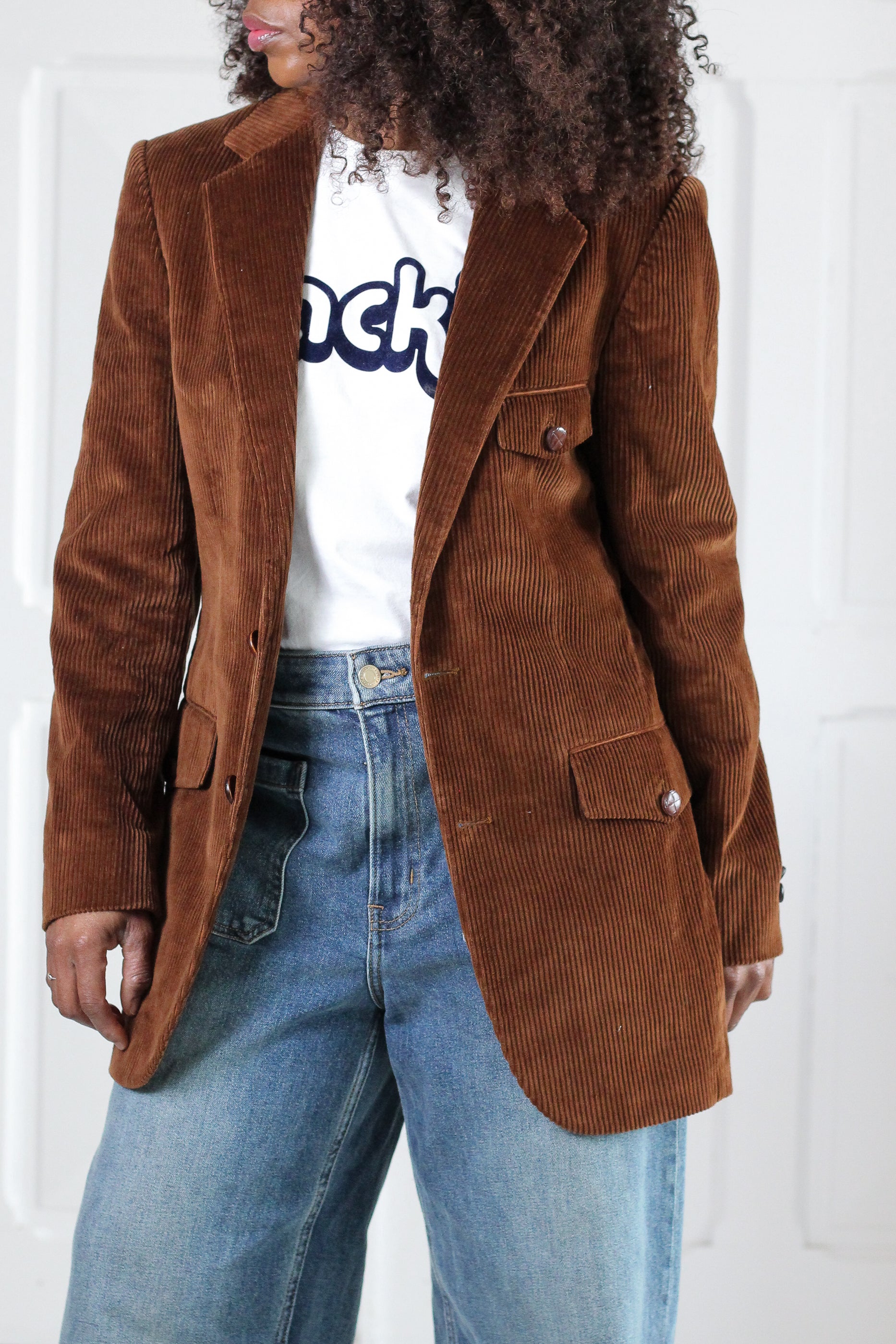 Blazer vintage en velours côtelé marron, datant des années 1970, période emblématique du vestiaire tailoring revisité avec des matières chaleureuses. Coupe droite structurée, col tailleur classique, poches plaquées et boutonnage sobre pour une silhouette élégante et intemporelle.