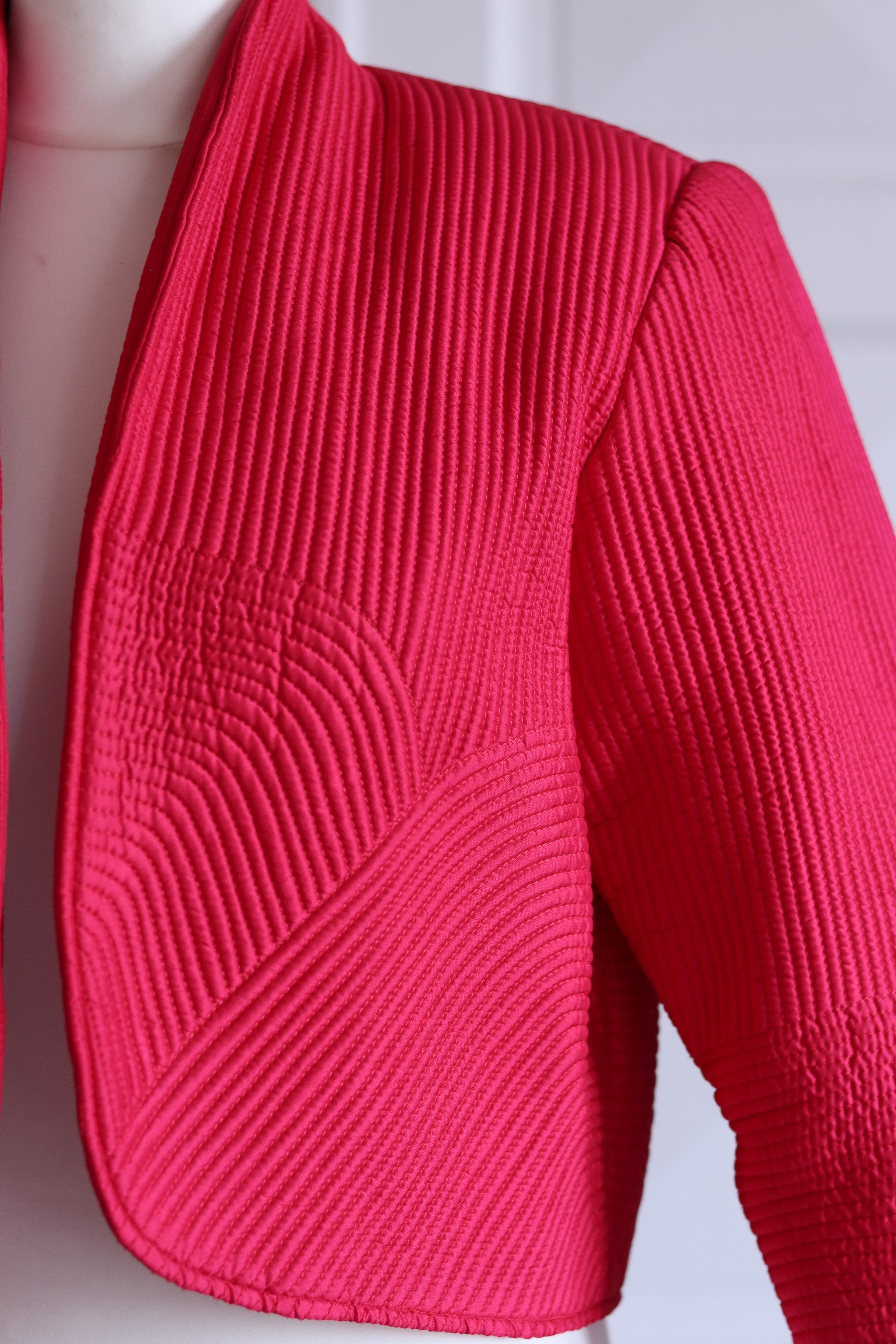 Pièce unique, confectionnée entièrement à la main, cette veste courte aux lignes sculpturales incarne le savoir-faire artisanal des années 80.