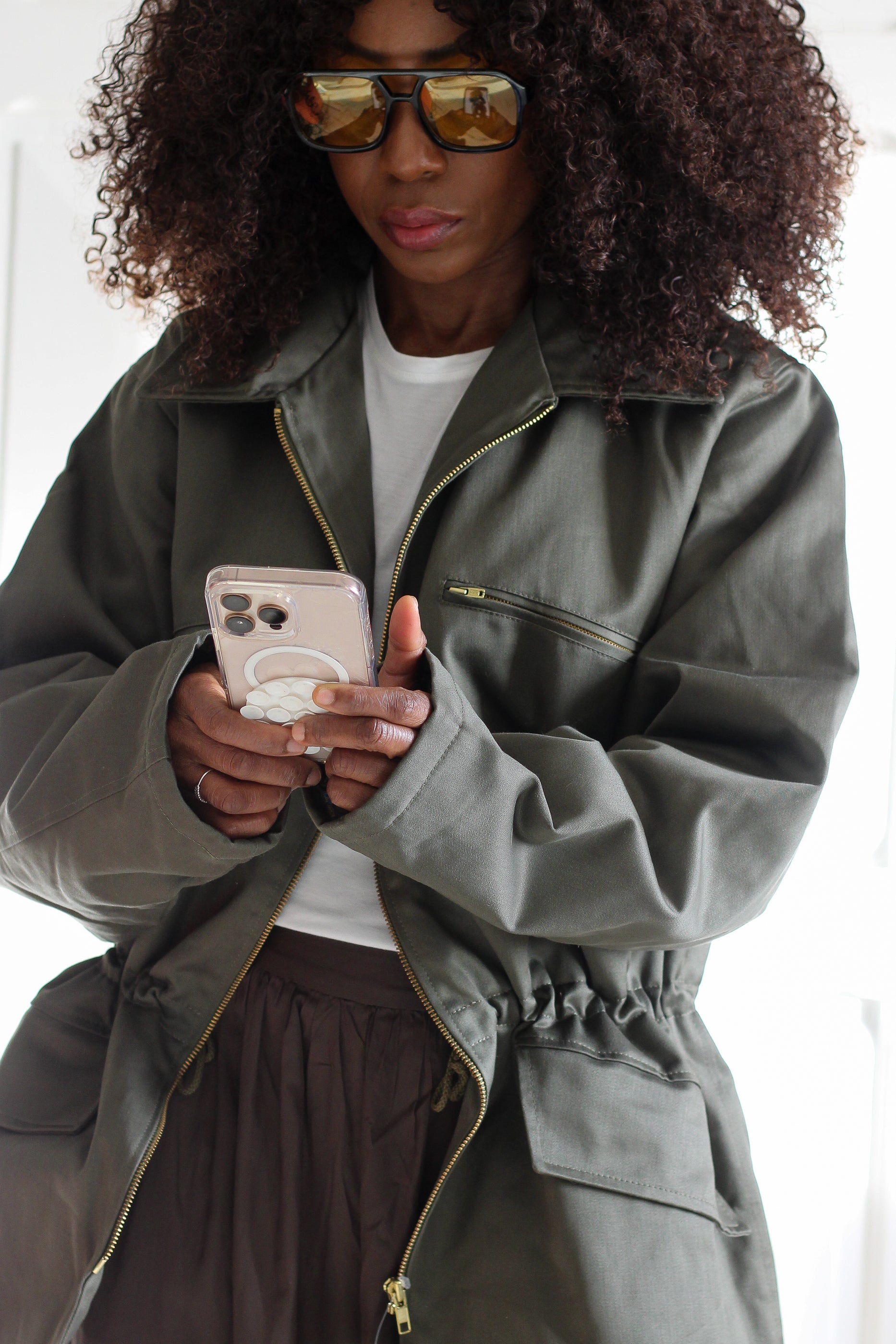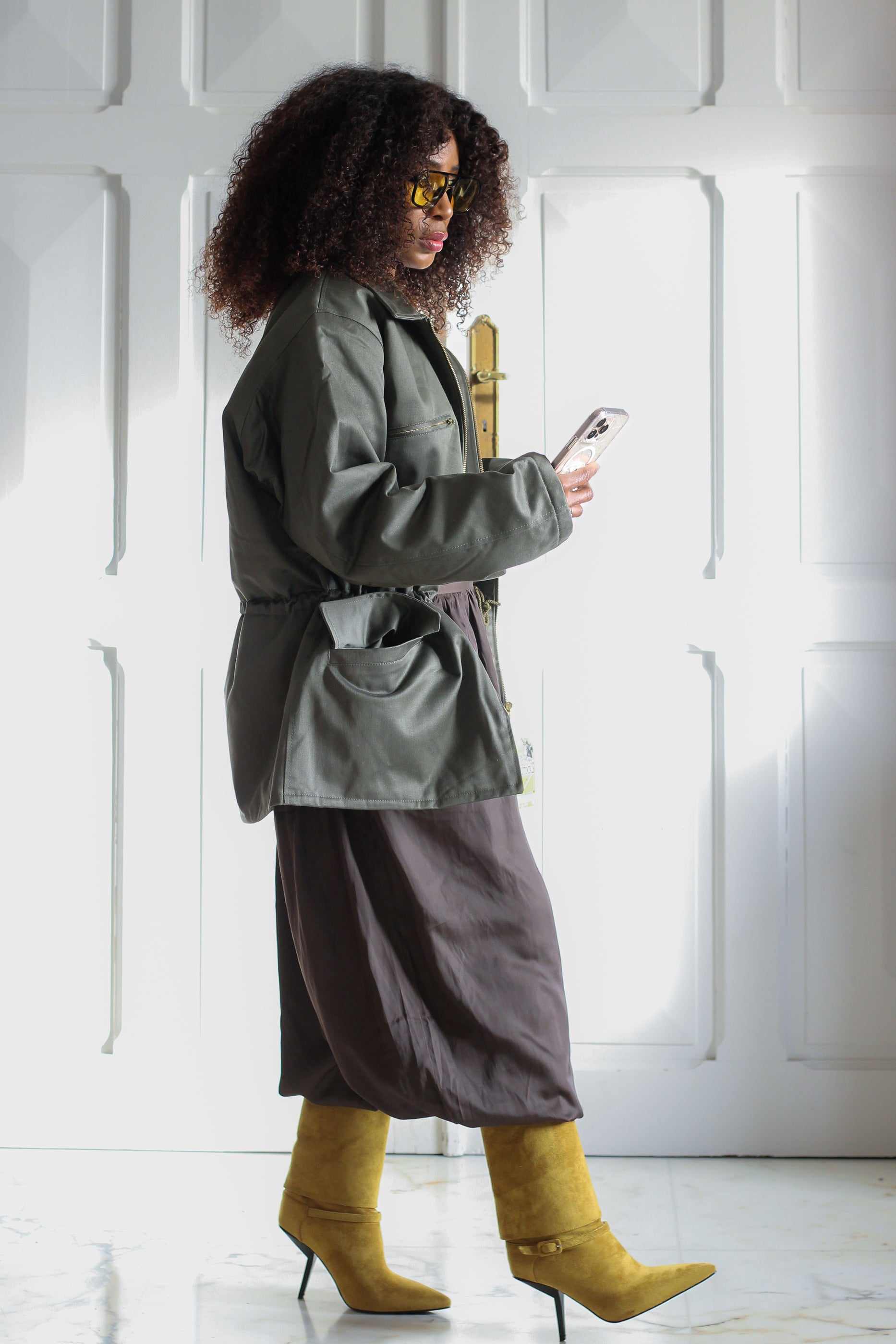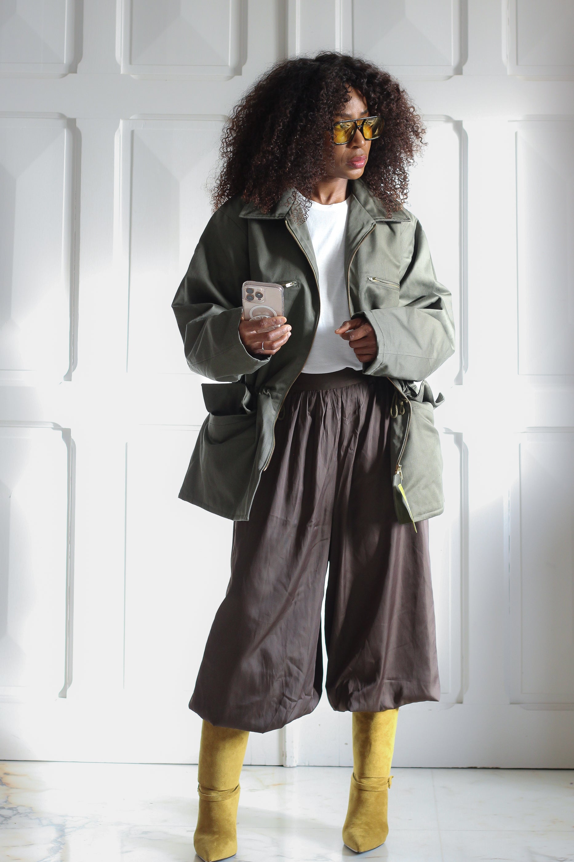 Veste d'employé service maintenance de l'armée, vintage datant des années fin 1970. Veste à la coupe droite légèrement oversize, un vert kaki et ce style workwear utilitaire qui traverse les décennies sans prendre une ride. Veste extérieure en 100 % coton et la doublure en 100 % acrylique. Belle pièce vintage de fabrication française. Elle se ferme avec une fermeture à glissière et possède plusieurs poches de rangement avec cordon centrale pour cintrer la taille.