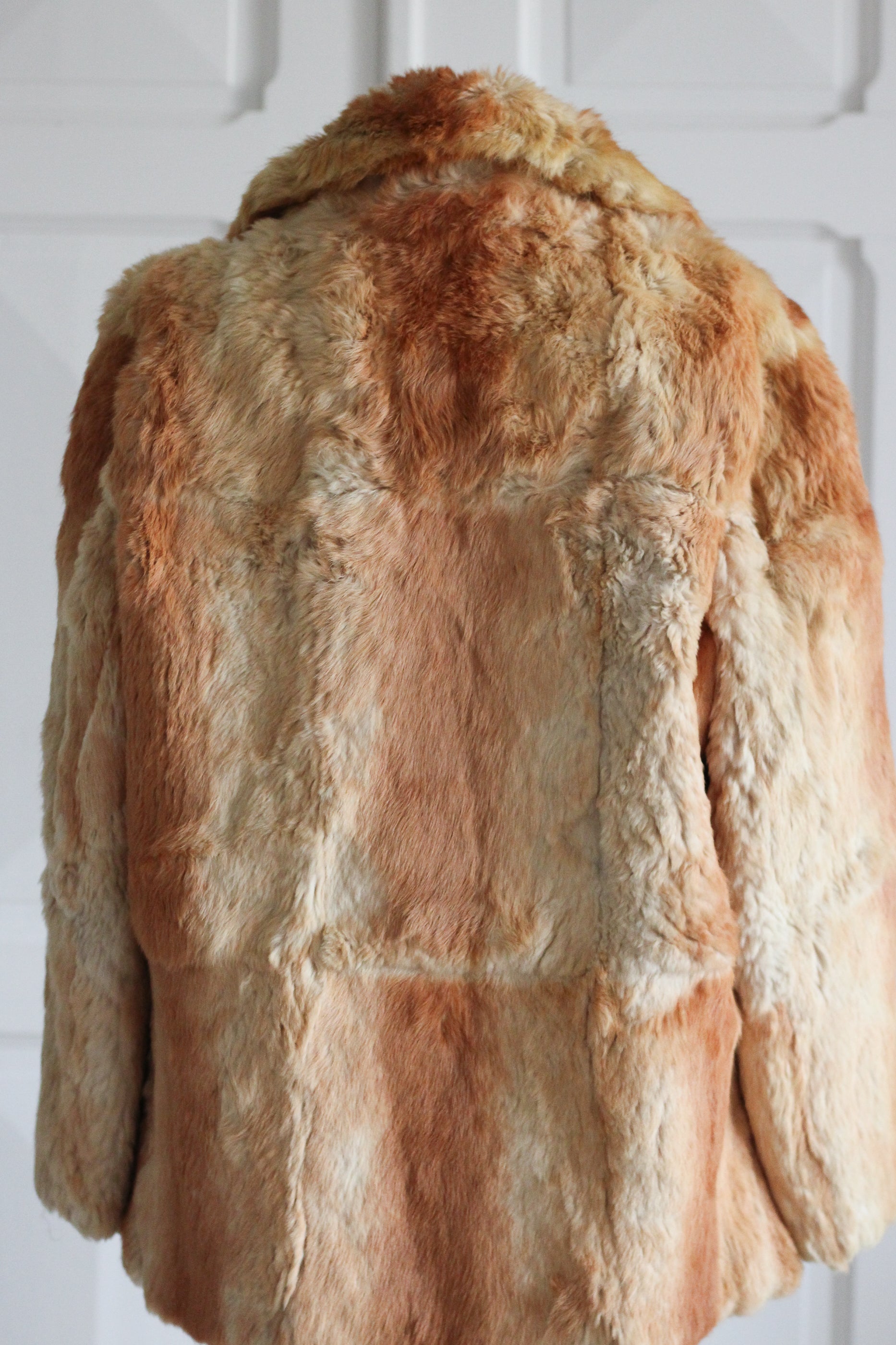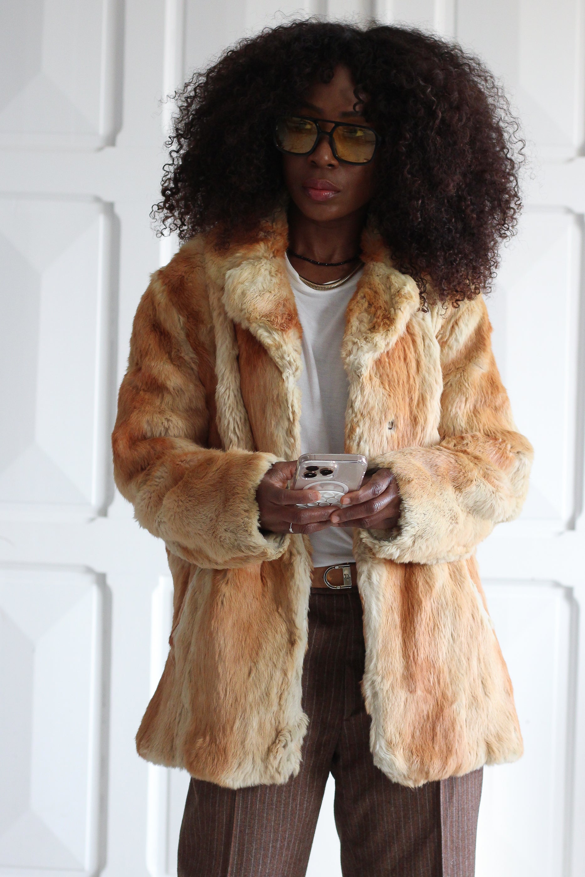 Manteau vintage en fourrure de lapin, belle pièce datant des années 1970, aux tons chauds miel, caramel et beige, avec un tombé fluide et une allure élégante et intemporelle. Le col est joliment travaillé, les manches sont agréables à porter et la longueur est idéale, ce qui en fait une pièce forte qui habille un look à elle seule, aussi bien en tenue quotidienne que plus habillée.