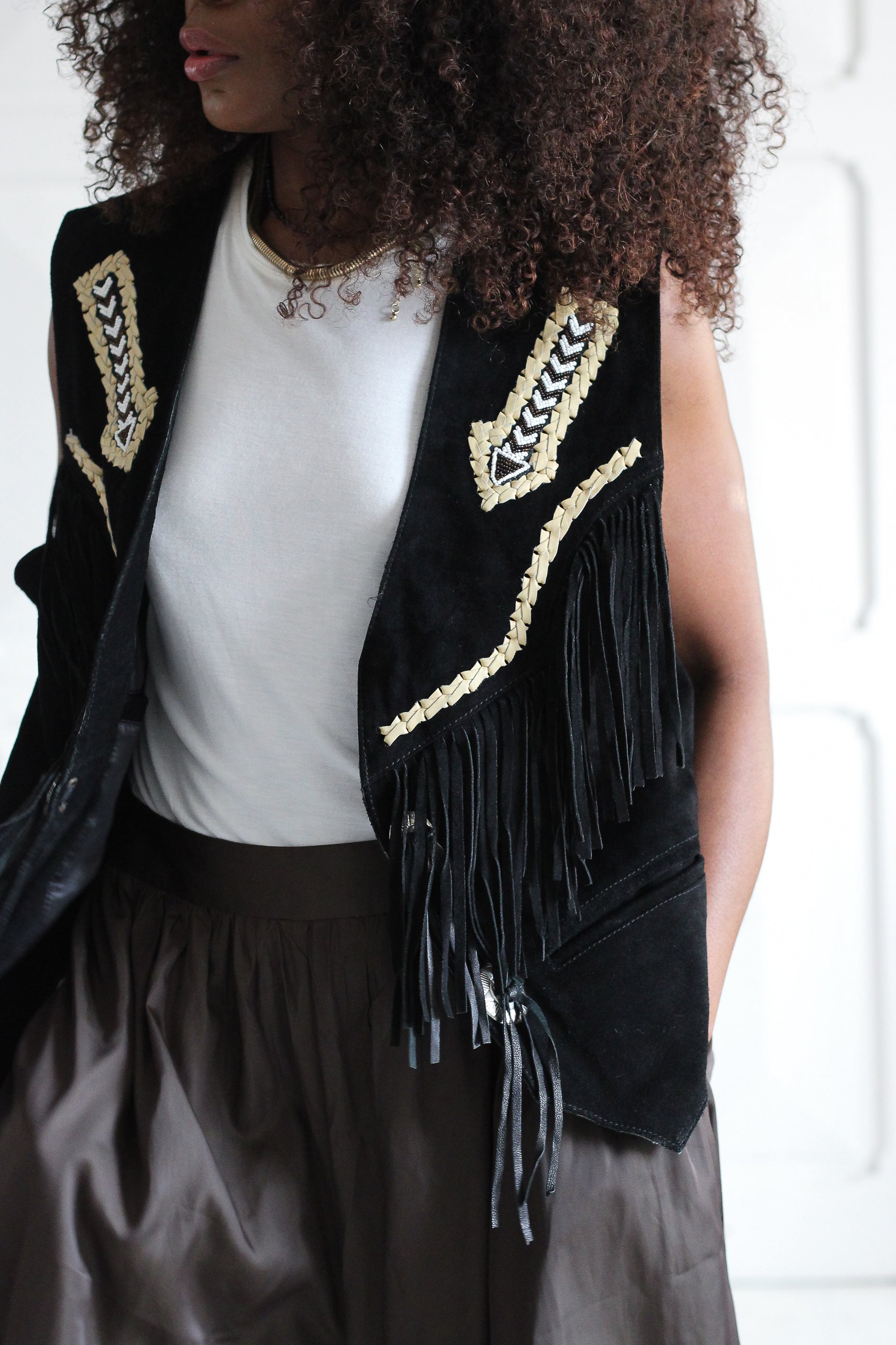 Gilet vintage à franges, en cuir daim véritable noire, richement décoré de détails tressés et broderies d’inspiration western / bohème. Coupe droite sans manches, avec franges sur le devant et le dos qui apportent du mouvement. Veste vintage datant des années 1970, création Epiderme