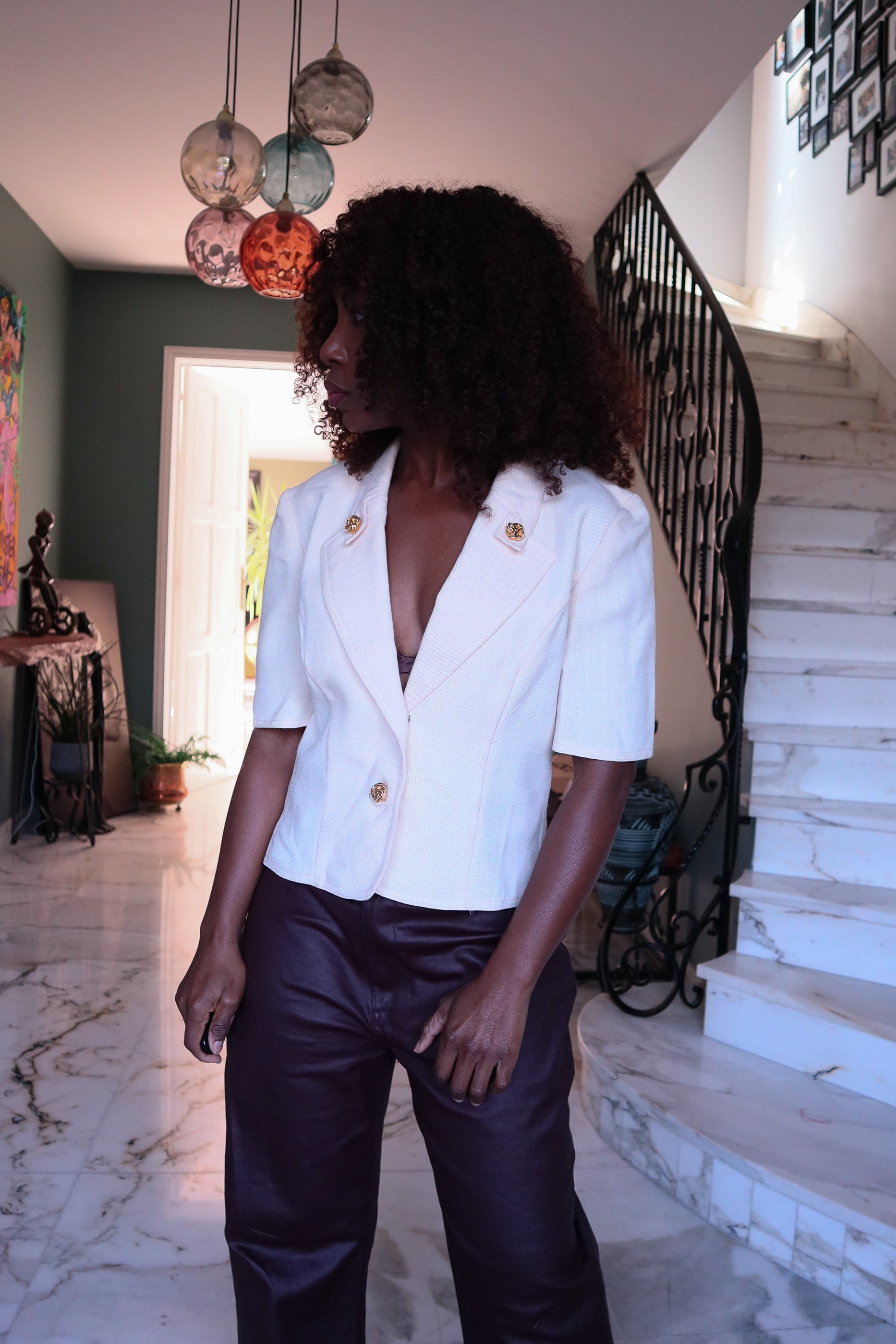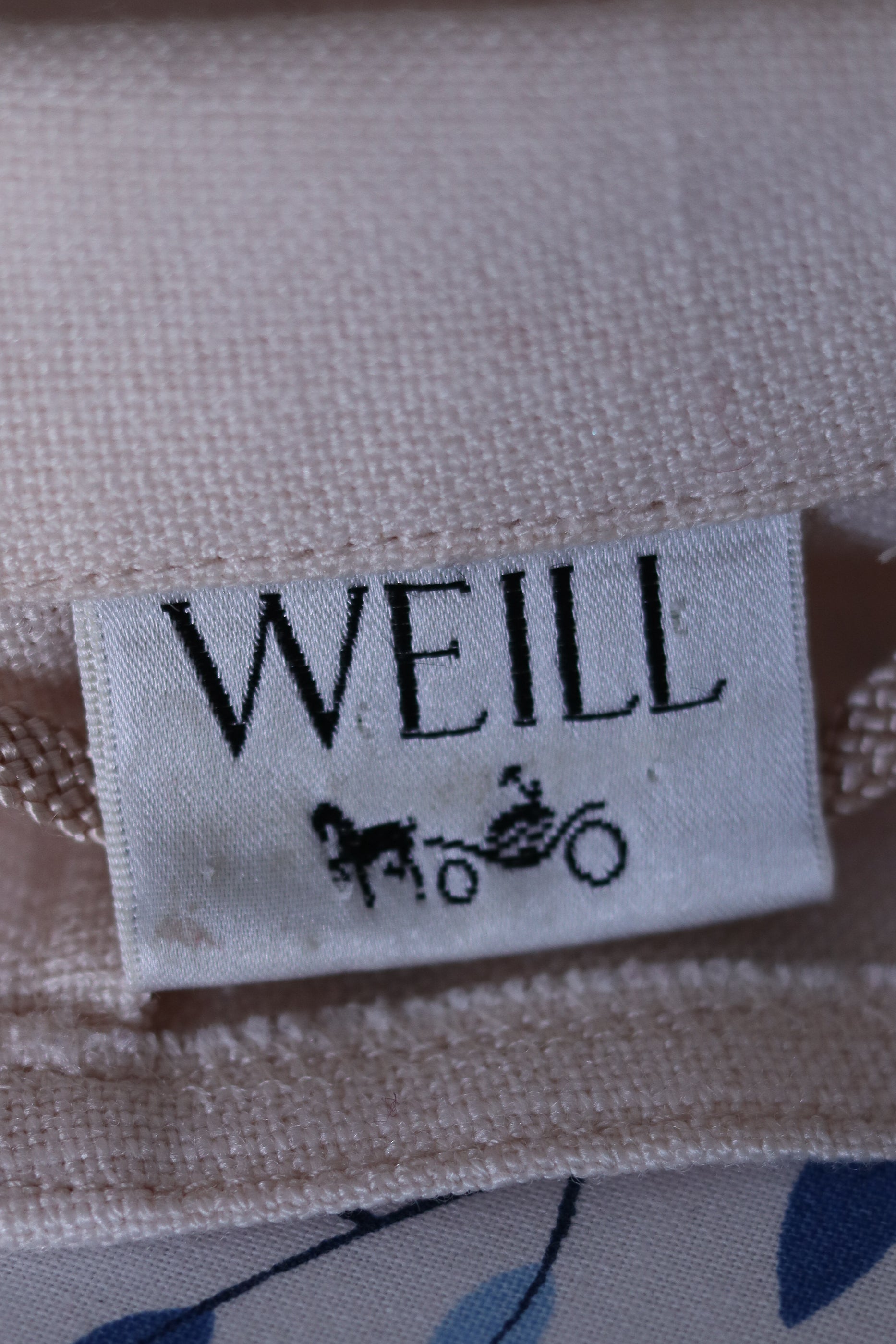 Une pièce élégante et raffinée signée Weill Paris, maison française emblématique du chic intemporel. Veste à l'aspect lin mais composé de 50 % de viscose et de 50 % de polyester, arbore une coupe féminine parfaitement ajustée, typique des années 80.
